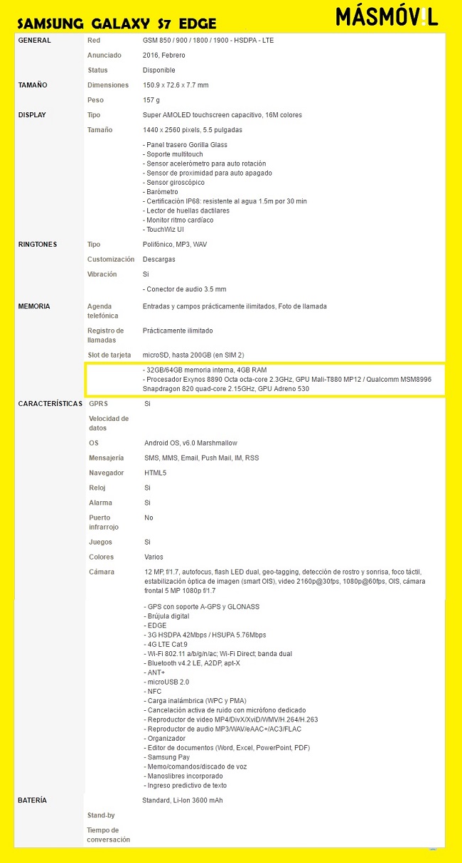 El Samsung Galaxy S7 edge mejora al Galaxy S6 edge, manteniendo la pantalla plegada hacia sus lados, pero mejorando sustancialmente sus características. Entre sus especificaciones más destacadas, cuenta con una pantalla QHD AMOLED de 5.5 pulgadas, procesador Snapdragon 820 o Exynos octa-core, 4GB de RAM, 32GB o 64GB de almacenamiento interno expandible, cámara de 12 MP con estabilización óptica de imagen, batería de 3600 mAh, y resistencia al agua.